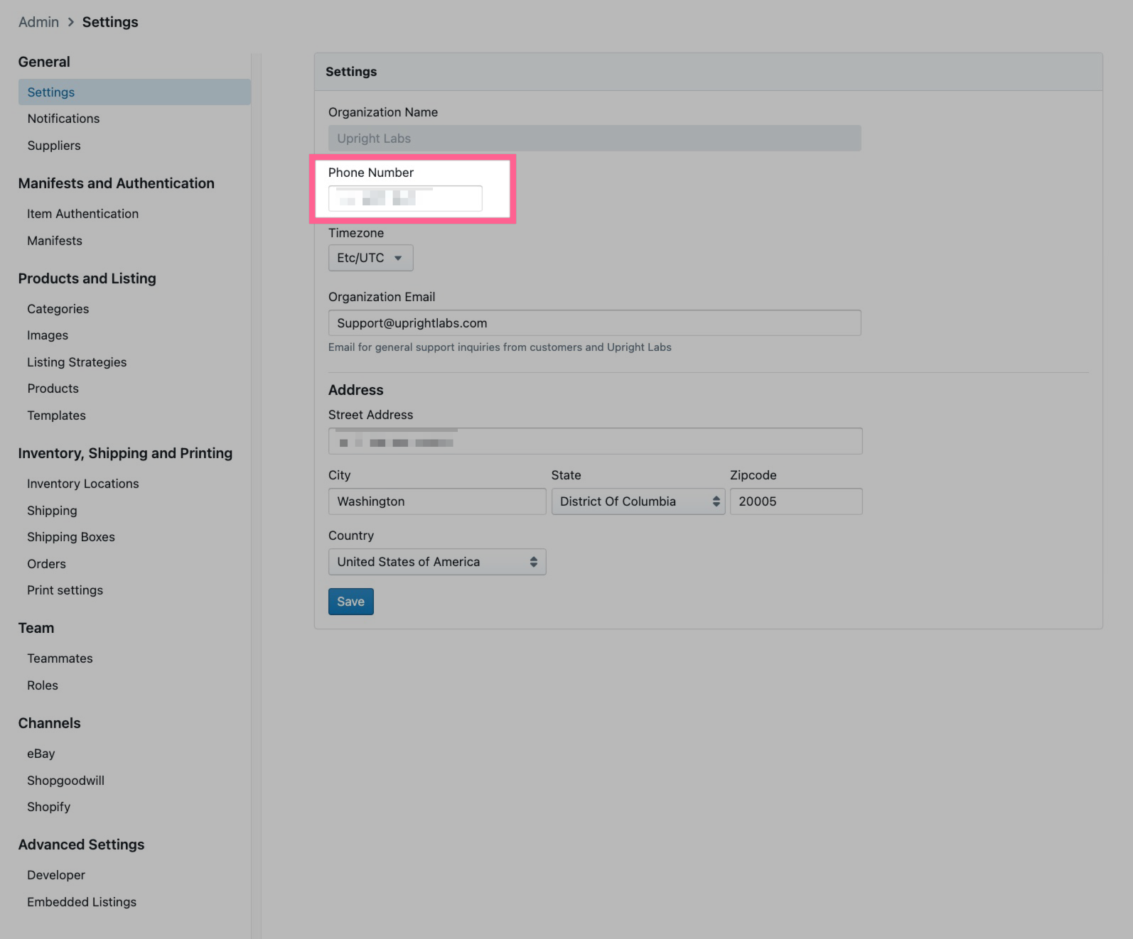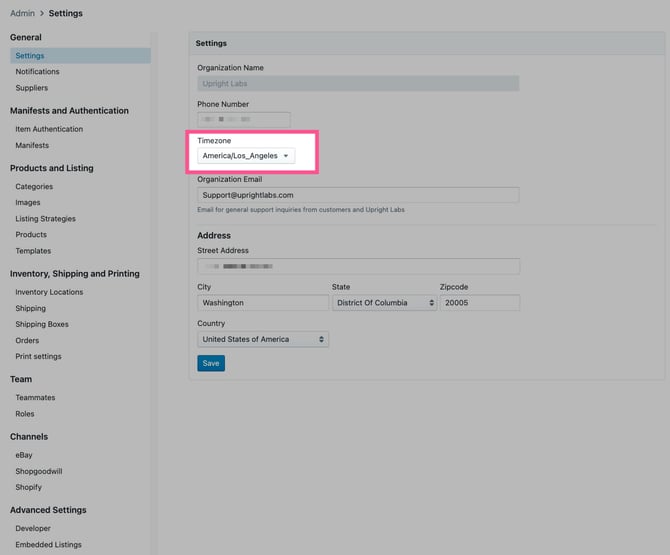 Your organization settings in Lister are where you set your contact phone number, the timezone for reports, e-commerce customer support email address, and shipping address for creating and calculating accurate postage labels.