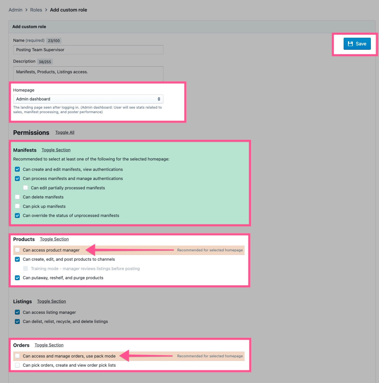 Recommended and required permissions will be highlighted for the homepage selection. Select related permissions, if needed, and click the blue “Save” button.