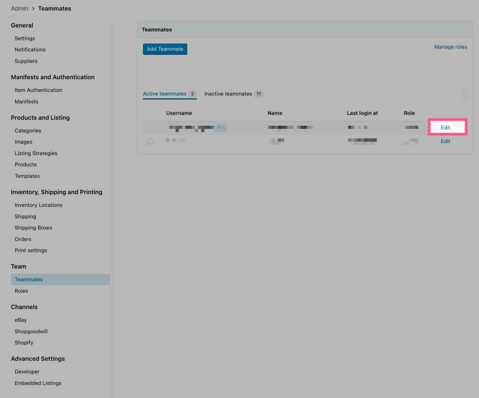 Clicking “Edit” next to a teammate allows you to change their basic information (name, username, password) and details (Role, Supplier, and Shopgoodwill username and password).
