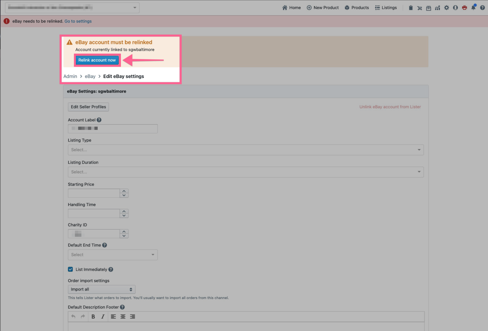 If you change your eBay credentials, you'll see a banner at the top of Lister asking you to re-link the account. All you need to do is be logged into your eBay account and click the blue “Relink account now” button from your eBay settings page in Lister.