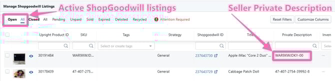 Note: The Seller Private description is the Lister SKU if you have enabled this toggle in your Lister > Admin > Shopgoodwill settings