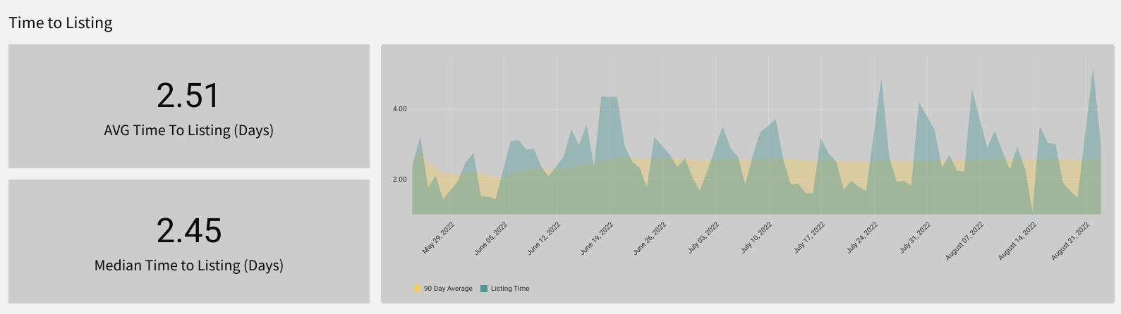 Time to Listing details the average and median time in days it takes after a manifest item is accepted to the time it is listed to an online marketplace.