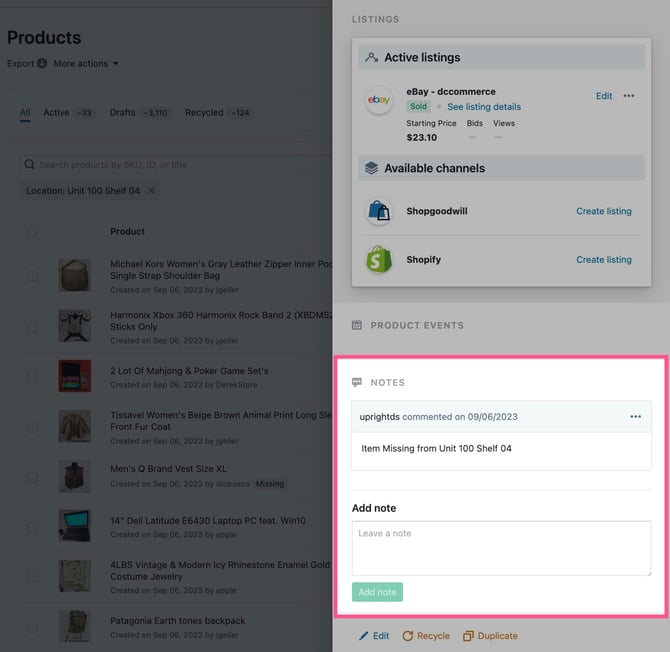 💡 Operational Tip: If an item is missing from the shelf, in addition to adding a “Missing” tag to the Product in Lister, use the Product Notes to leave an internal note on when the item was discovered missing. This helps create a stronger paper trail if the item is later recovered in a different area of inventory.