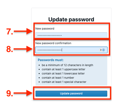 7. On the password update screen, enter your new password. Remember, it must include all of the following: