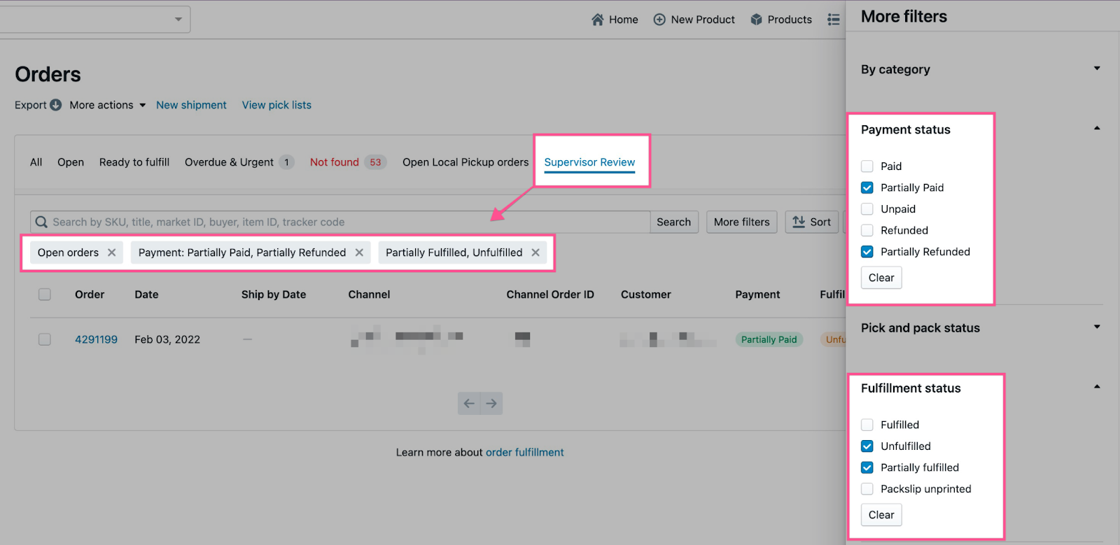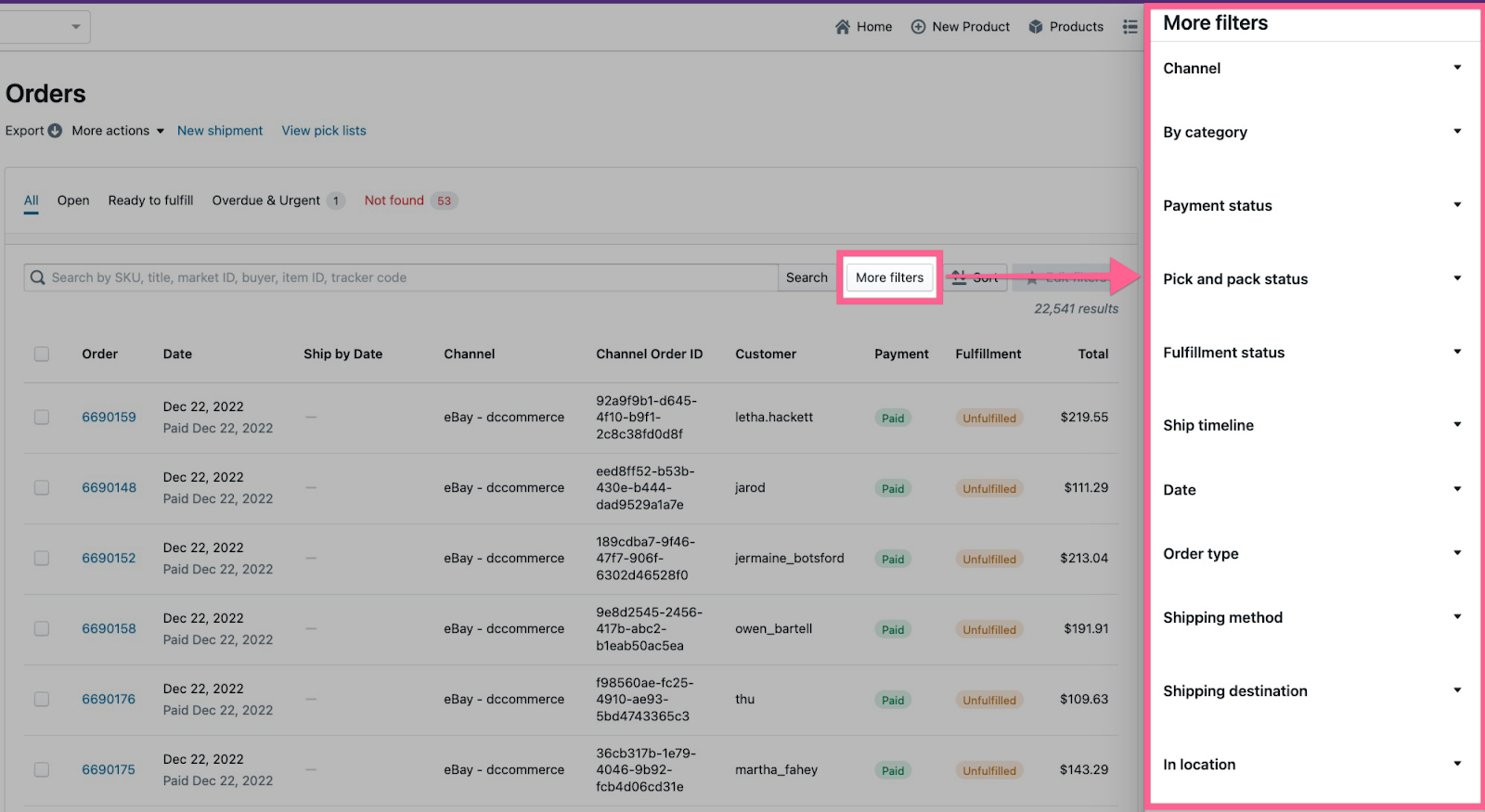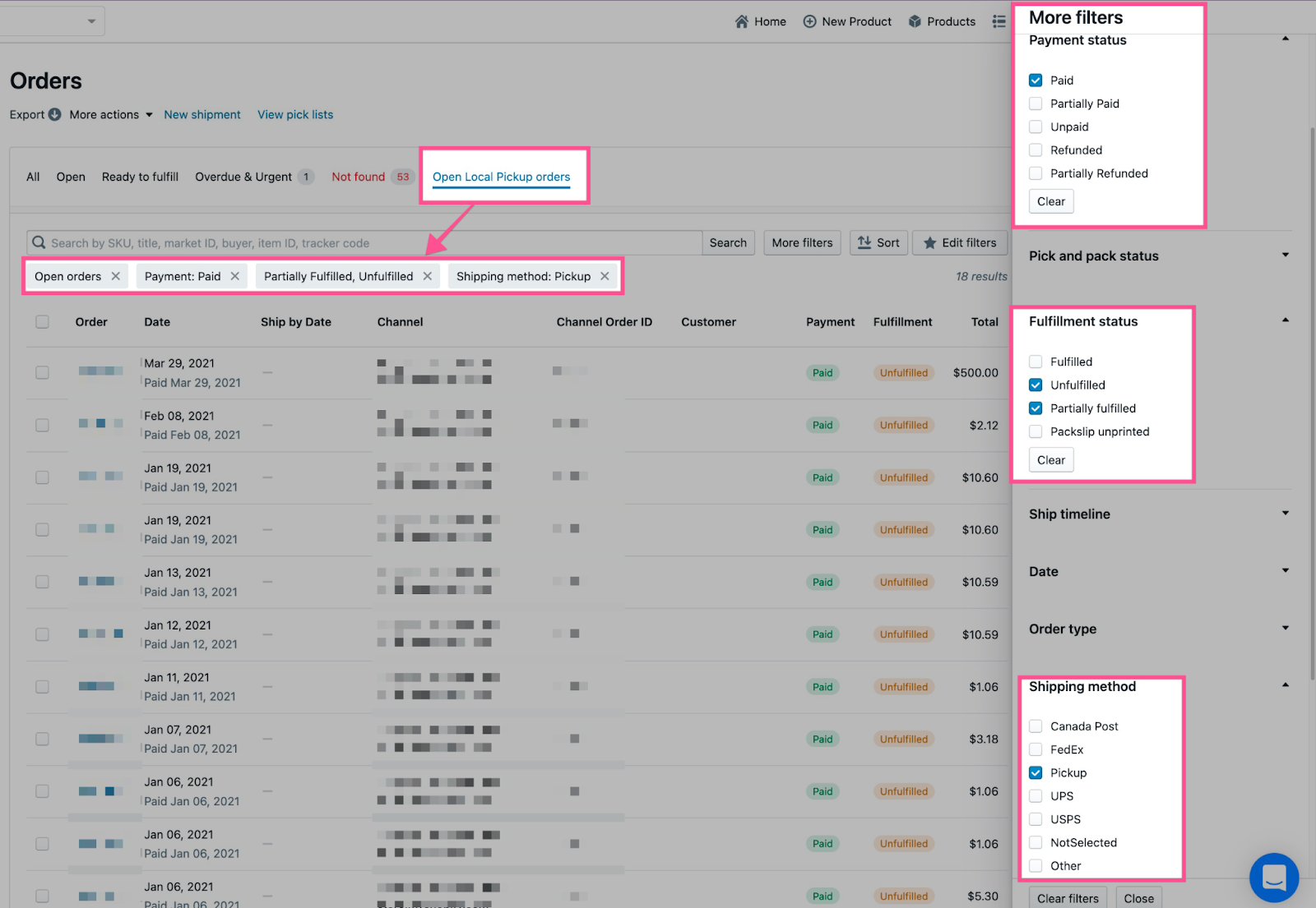 Filter presets can save you a ton of time looking up specific types of orders by applying certain filters. Click the “More filters” button in the upper right corner of the orders page to view available filters.