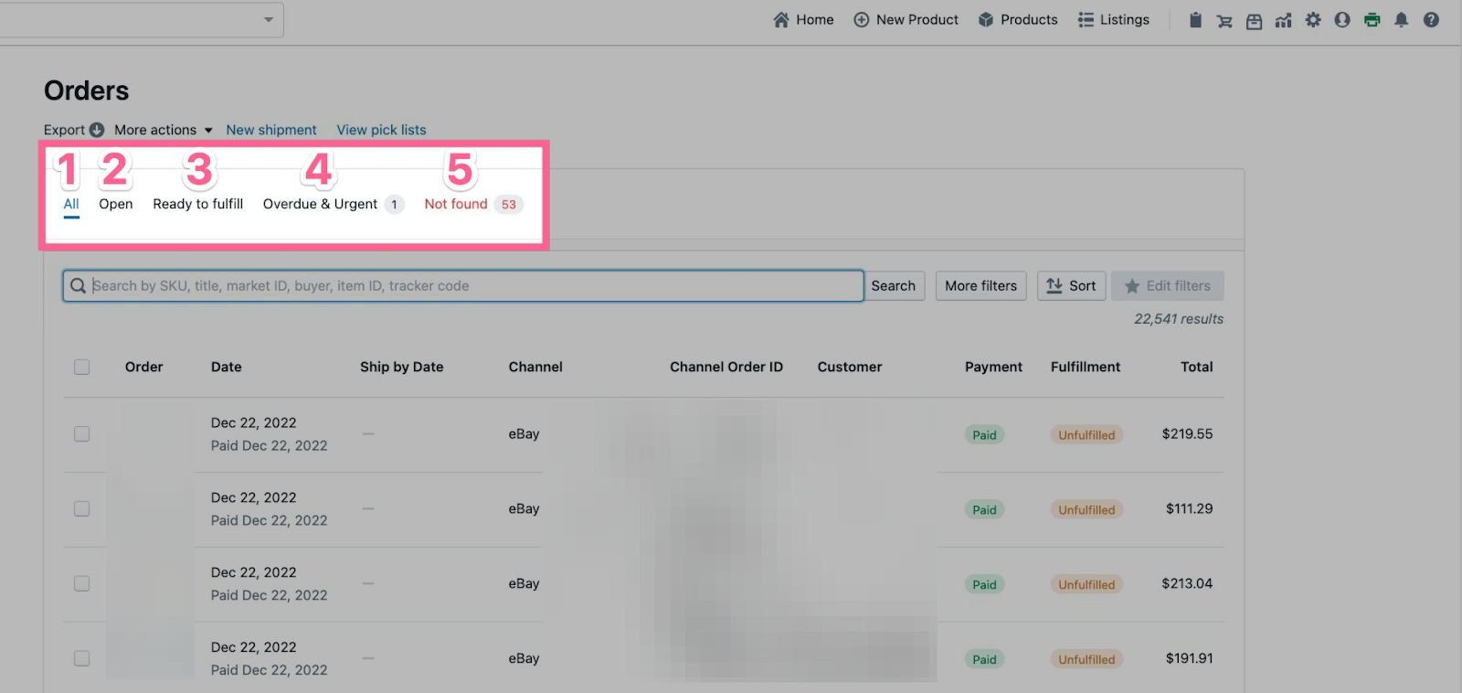 Lister has 5 default filters to view your orders. Clicking these filters will show you orders that meet the criteria explained below: