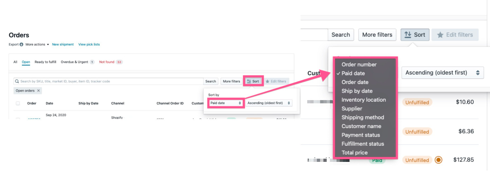 Click the “Sort” button in the upper right corner of the orders page to choose how to sort orders.