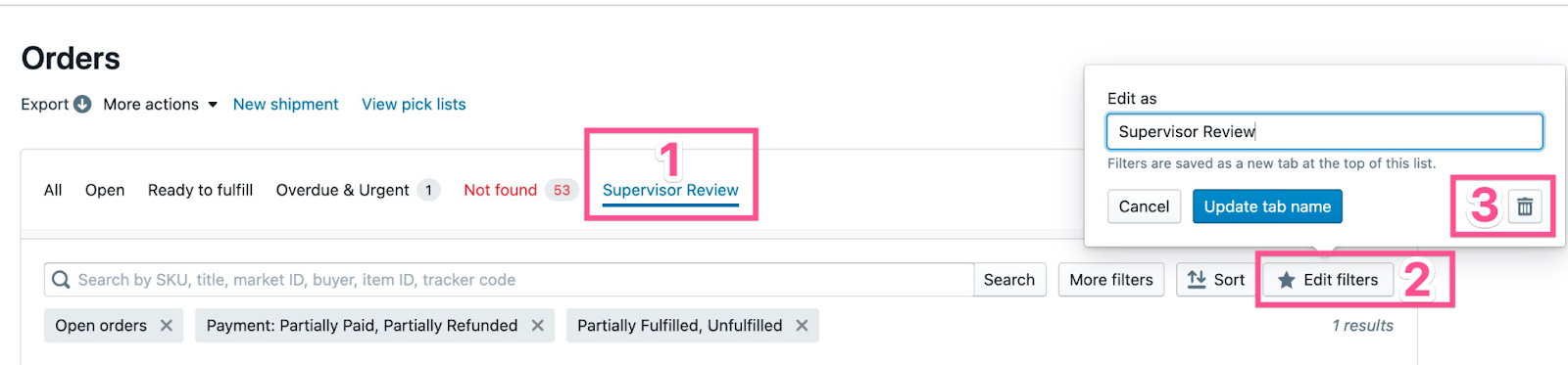 - Click the name of the filter you want to edit from the top of the Orders page