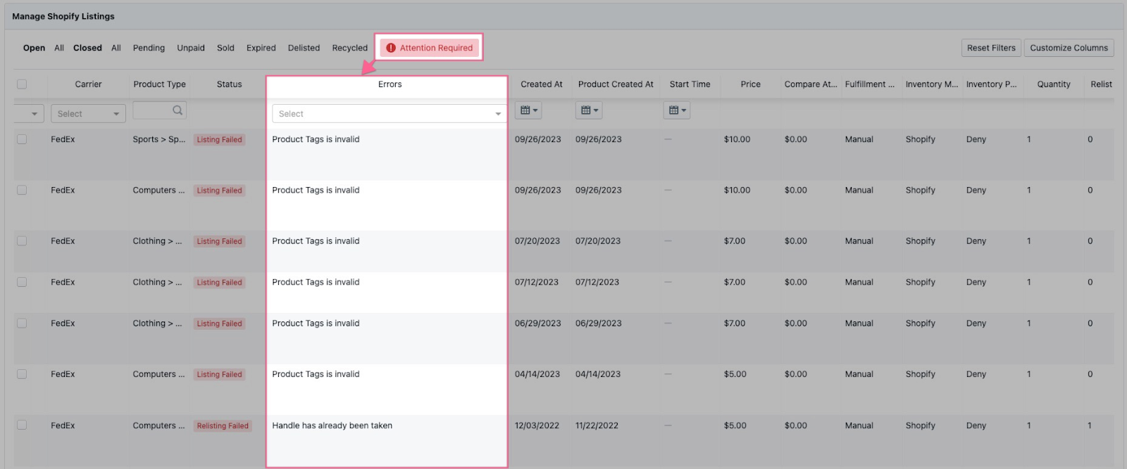 When a Shopify listing has an error that prevents it from listing, it will appear in the Attention Required tab of the listing manager until the underlying issue is manually corrected.