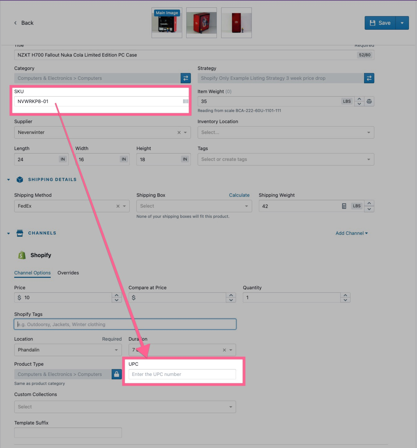 When listing a product available for sale via Shopify POS and online, copy the SKU from the top of the listing page and paste it to the “UPC” field in the Shopify Channel Options section. This allows the Lister SKU barcode to be scanned in the Shopify POS App at checkout to add the item to the shopping cart.