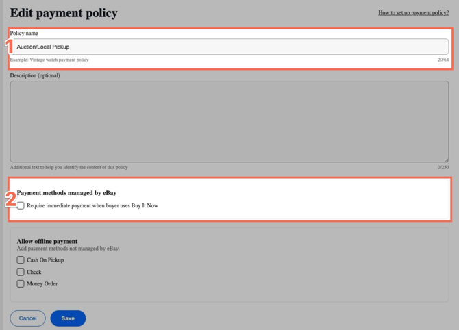 This policy allows buyers to pay within your stated payment window in your eBay Awaiting Payment preferences. This policy should be used for auction format listings and Local Pickup items