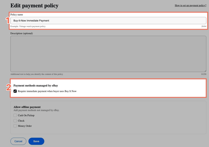 - Name the policy clearly to identify it for Buy-It-Now Immediate Payment