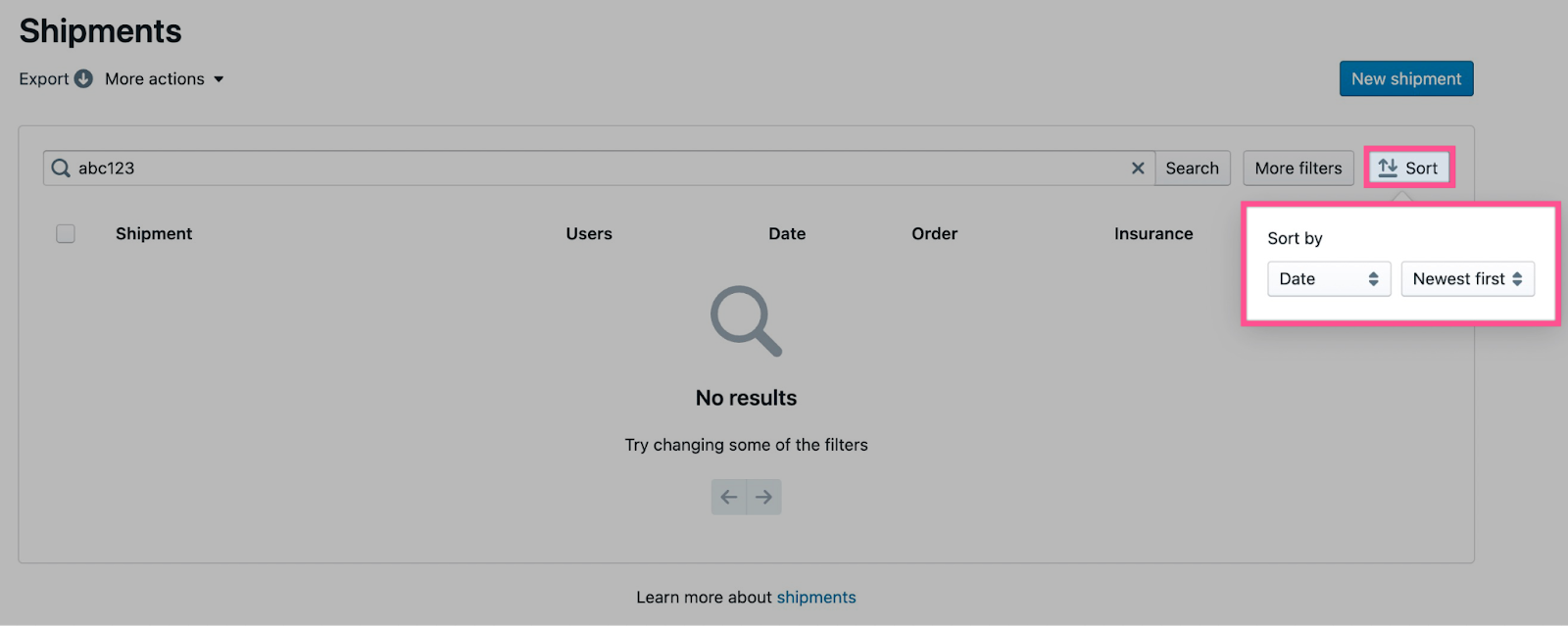 The Shipments page search results display every shipment sent from Lister. Each row details information about the shipment, including the shipment’s carrier and date created.