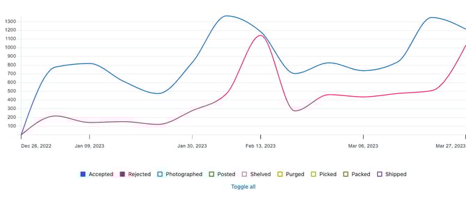 💡Operational Tip: The legend below the line chart lets you view or hide actions by clicking the stat. For example, you could focus solely on your Photography productivity. Or, to gauge your efficiency across multiple statistics (like processing manifests), turn everything off (“Toggle all” at the bottom), then check Accepted and Rejected. Leave all stats turned on to get a bird’s eye view and spot unusual trends.