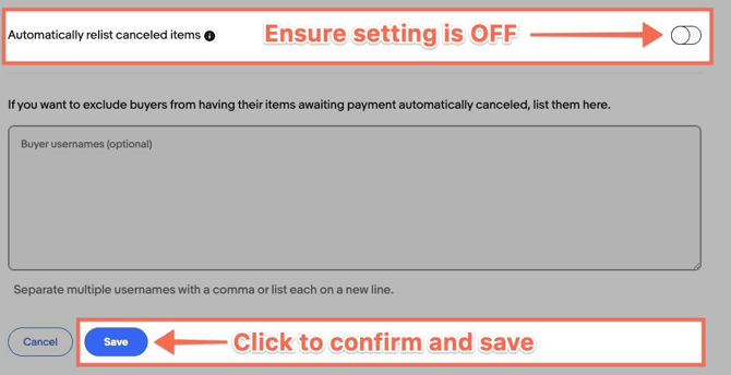 - IMPORTANT: Ensure the "Automatically relist canceled items" setting is toggled OFF. If toggled on, Lister and eBay will create duplicate listings, potentially leading to double sales. Click here to learn how to safely cancel orders on eBay
