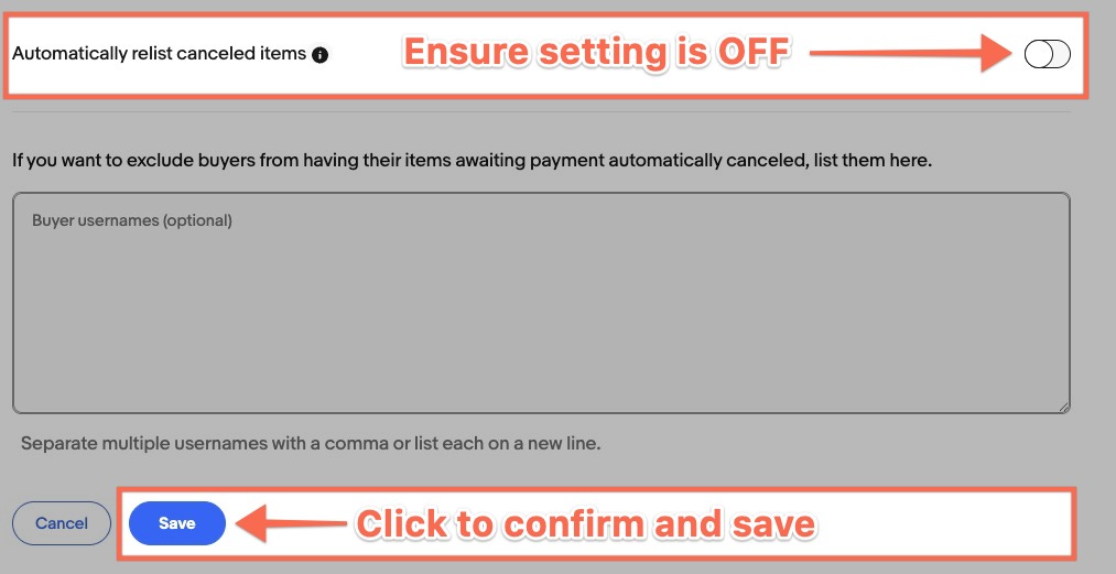 3. IMPORTANT: Ensure the "Automatically relist canceled items" setting is toggled OFF. If toggled on, Lister and eBay will create duplicate listings, potentially leading to double sales. Click here to learn how to safely cancel orders on eBay