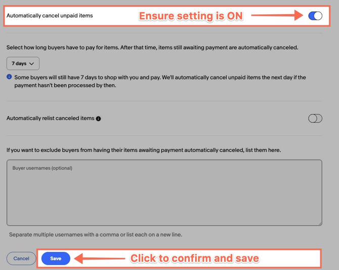 - Ensure the "Automatically cancel unpaid items" setting is toggled ON