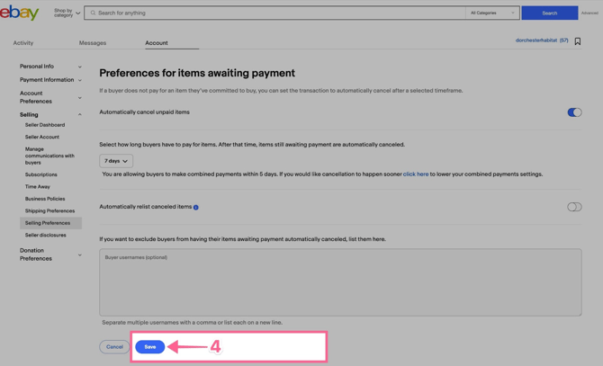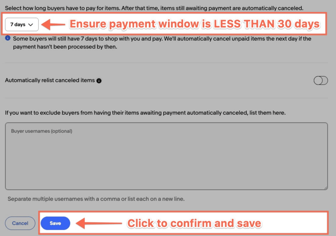 - Select how long buyers have to pay for items. After that time, items still awaiting payment are automatically canceled. This setting must be set to less than 30 days to avoid double sales!