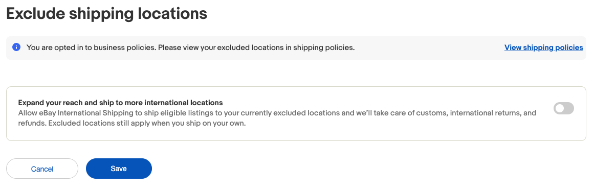 This settings page in eBay controls excluded shipping locations (for example, international or US Protectorates), allowing combined payments and shipments, calculated shipping rules, and other settings related to how you ship eBay items.