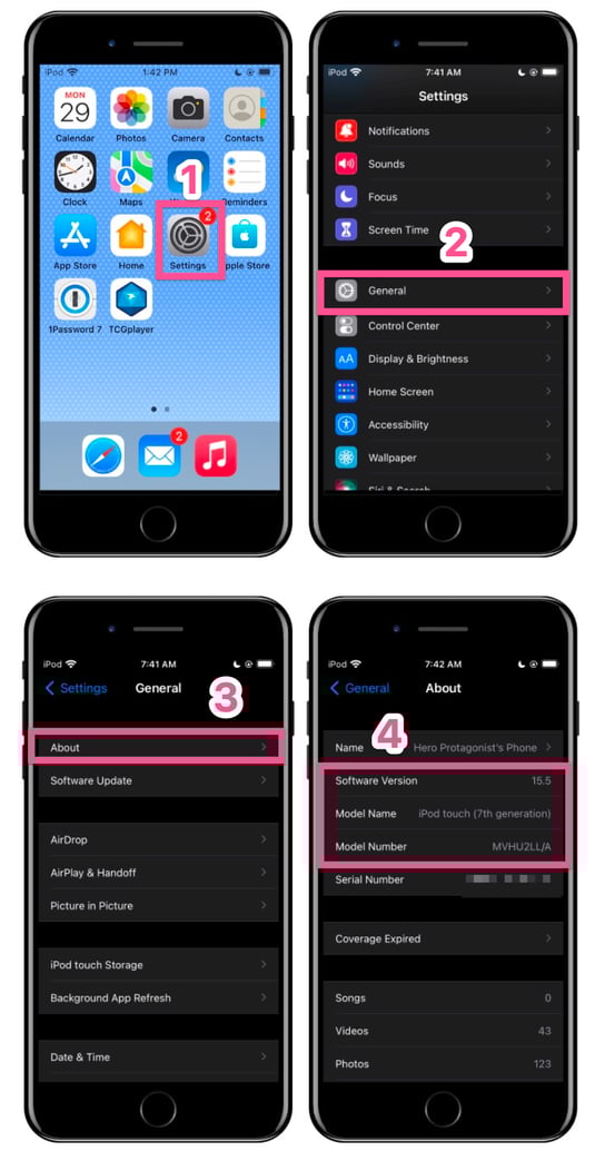iOS software version, device model name, and model number are listed at the top of the screen